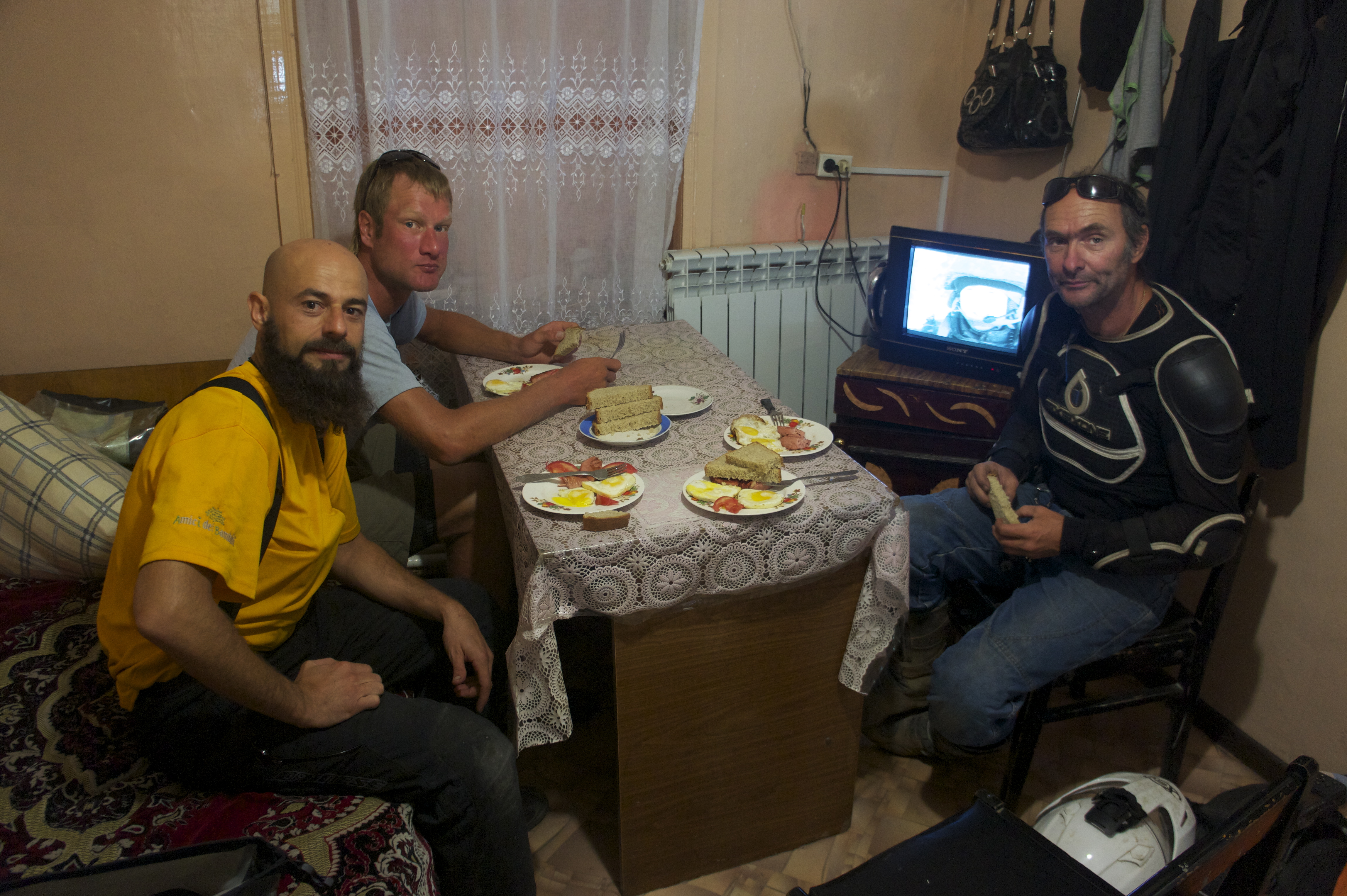 We still can’t believe the luck of having met Thyerri and Alvaro in Ulan Bataar. Thanks to their knowledge of fixing our bikes we were able to leave this morning heading toward the Russian border. Thierry decides to change his plans to go to Vladivostok and come with us to Japan. Matteo and myself can’t ask for any one better to come with us across Siberia. Siberia is a hard place to be and the more we are the safer it will be. The three of us leave Ulaanbataar at around noon after having settle the bill with Sybille at the OASIS caffe & guesthouse. The trip out of Mongolia is pretty easy because the road is paved and the scenery is not what we experienced last year. Many people arrive to Mongolia from the north and leave from the same routes. If you plan to visit Mongolia make sure you enter from the western border of Tashanta and make your way to the Capital city of Ulaanbataar. If you just do the north part in and out you have not been to this magic place. Anyway, we arrive to the border with no complication and go through custom in a relative smooth way. Decompressing from all the stress caused the day before we decide to find a cheap place in the little border village of Kyakhta. Total cost for a room for the three of us was 1500 Rubles. At this little hotel we meet a German guy that is doing basically the same route as we are. The only difference is that he is doing it on a bicycle. His name is Stephen Herb and I understand this is not his first trip of this kind. Its hard enough doing what we are doing on a motorcycle but I can’t imagine doing this on a bicycle. Good luck Stephen, have a great journey.